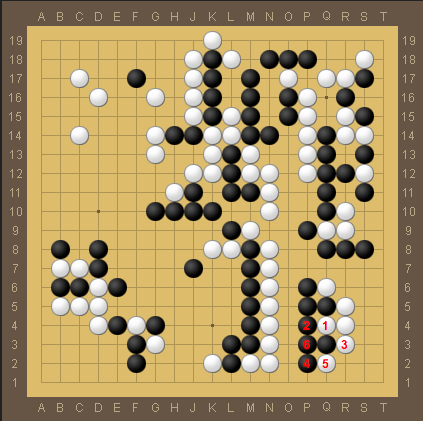 This diagram shows the sequence in game 1 starting with white's move 130 and ending with black's move 135. In human play, the exchange of move 1 for move 2 would be considered a mistake if white's plan was to play 3 rather than cut (play at 6). This is because the overal result of the exchange is that white's stones have one fewer liberty, potentially allowing black to have more possibilities in the corner.